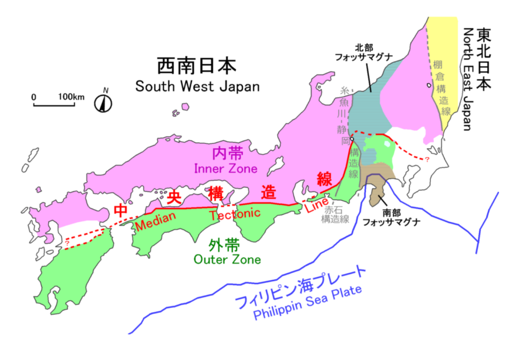 中央構造線を境にして、日本海側を内帯(ないたい)、太平洋側を外帯(がいたい)と呼んでいます。
