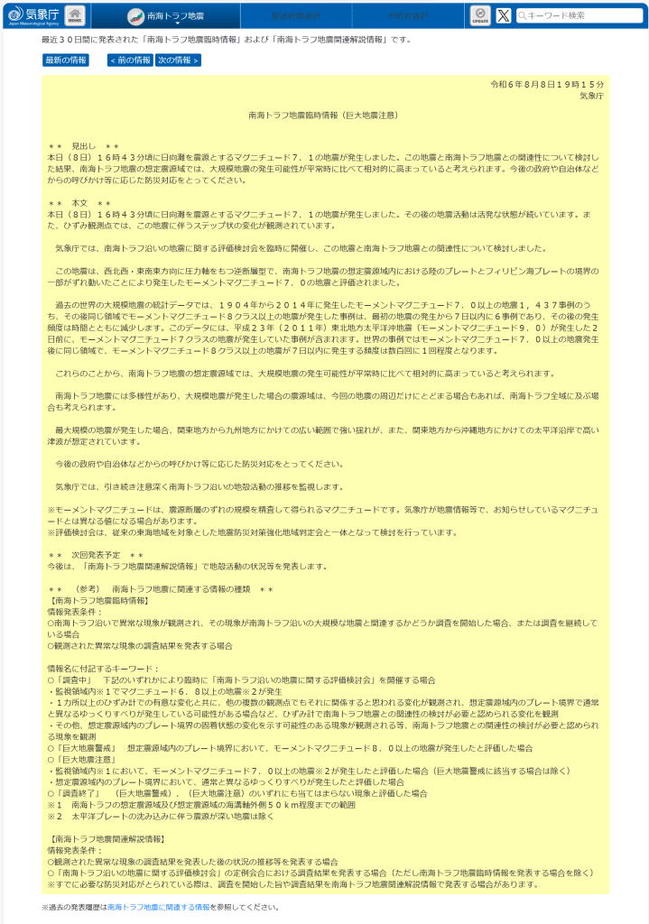 8月8日16時42分に日向灘を震源とするマグニチュード7.1(モーメントマグニチュード7.0)の地震が発生しました。