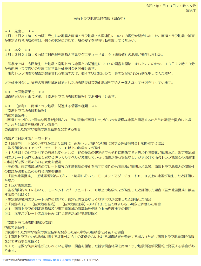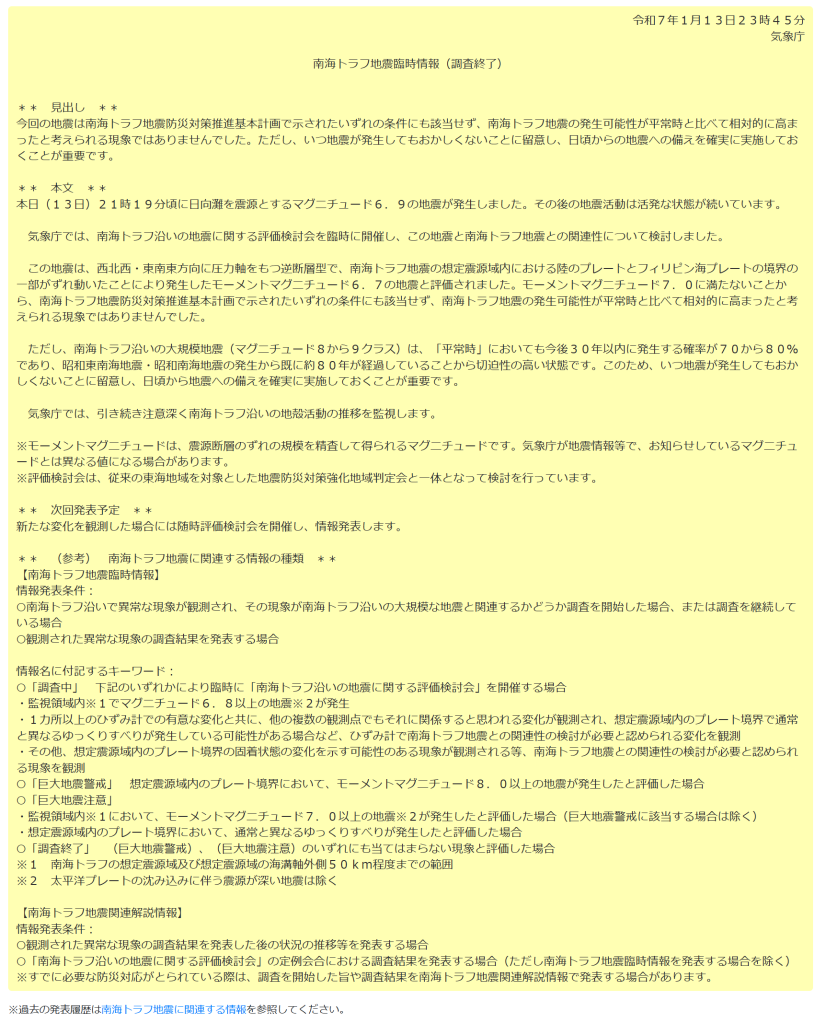 気象庁では、今回の地震と南海トラフ地震との関連性について調査を開始しました。南海トラフ沿いの地震に関する評価検討会が開催された結果、南海トラフ沿いの大規模地震が発生する可能性は低いとのことです。しかし、南海トラフ沿いでは、いつ大地震が発生してもおかしくないことから、南海トラフ地震に備えて、今後も南海トラフ地震臨時情報に注意しましょう。